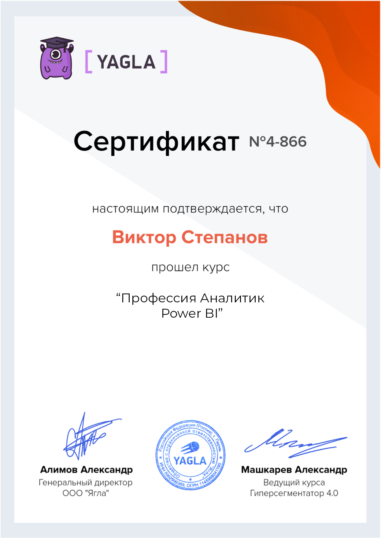 По результатам успешного тестирования вы получите сертификат Yagla, который подтвердит, что вы не просто прошли курс, но и усвоили весь материал.